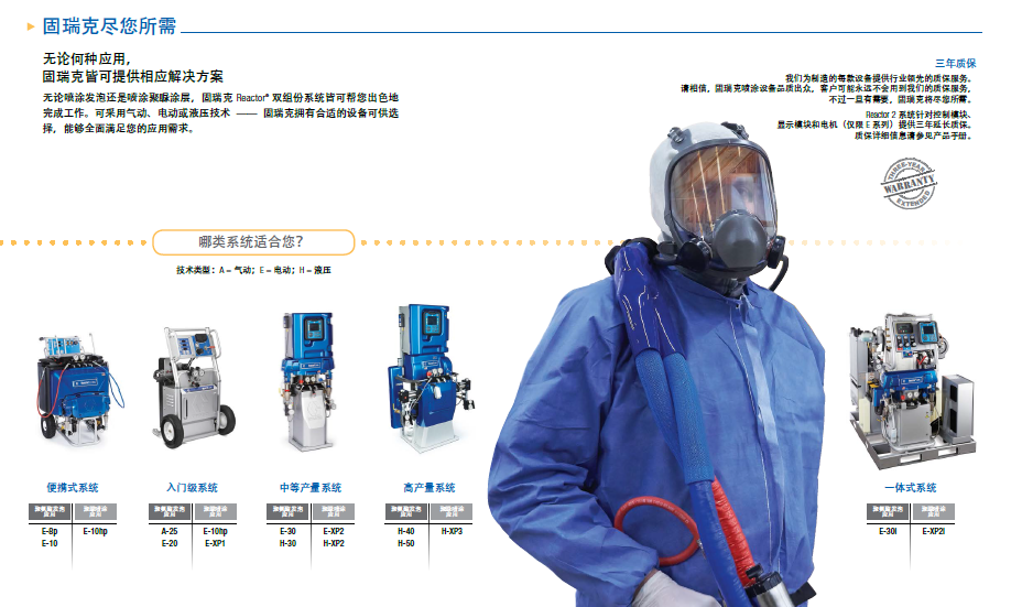 自1926年以来,Graco有限公司已成为建筑业、制造业、加工业和维修行业中流体处理优质泵和喷涂设备提供商的领军者。翌胜机电结合美国固瑞克(GRACO)公司领先水平的现代涂装技术,为众多用户提供了先进的涂装设备和优质的售后服务,成为行业领先水平的涂装机具和解决方案的产品服务商。Reactor聚氨酯发泡和聚脲喷涂设备适用于快速固化双组份应用。无论喷涂发泡还是喷涂聚脲涂层,固瑞克Reactor双组份系统皆可帮您出色地完成工作。可采用气动、电动或液压技术--固瑞克拥有合适的设备可供选择,能够全面满足各种应用需求。